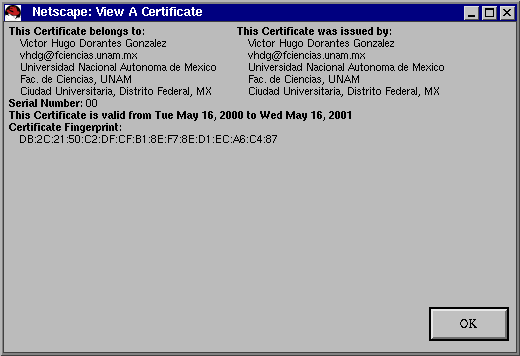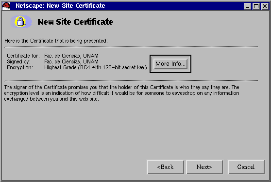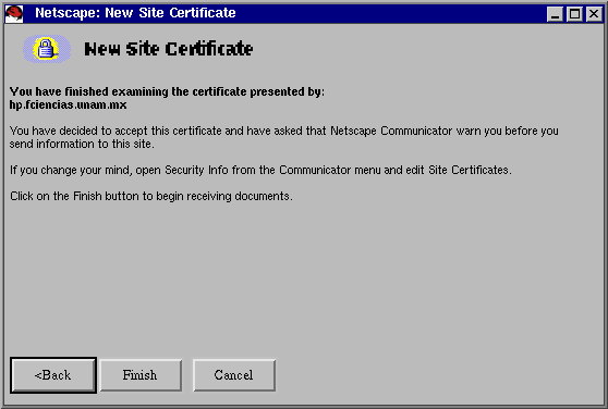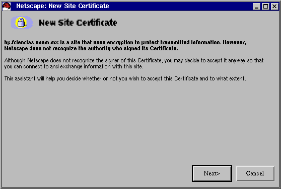 A continuación Netscape nos presenta un asistente para aceptar o no el certificado generado por el servidor hp.fciencias.unam.mx.