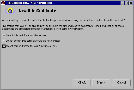 Habilitar la opción de aceptar el certificado por esta sesión, o bien por siempre, según lo que convenga. Hacer click en Next .