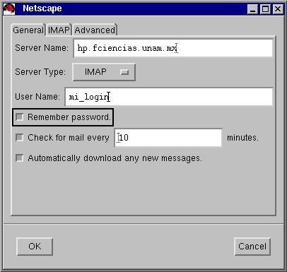 Si dese no volver a teclear su password la próxima vez que utilize Netscape para consultar su correo de el servidor hp, entonces habilite la opción Remember password