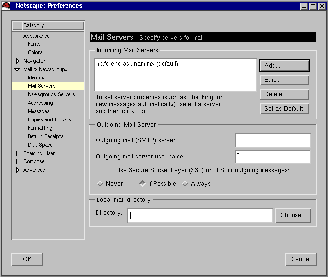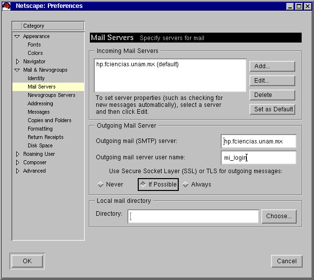 Llenar el apartado Outgoing Mail Server con hp.fciencias.unam.mx en la sección de servidor y su login de usuario en nuestro servidor hp como el user name. Habilitar la opción de if Possible en referencia a utilizar SSL como se muestra en la imagen 1.2.1