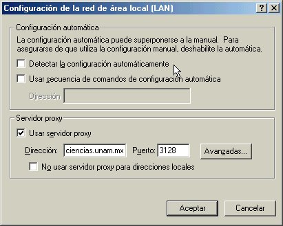 Enseguida, se llena el campo Dirección con pearl.fciencias.unam.mx y Puerto con 3128 quedando la ventana como lo muestra la figura 1.7